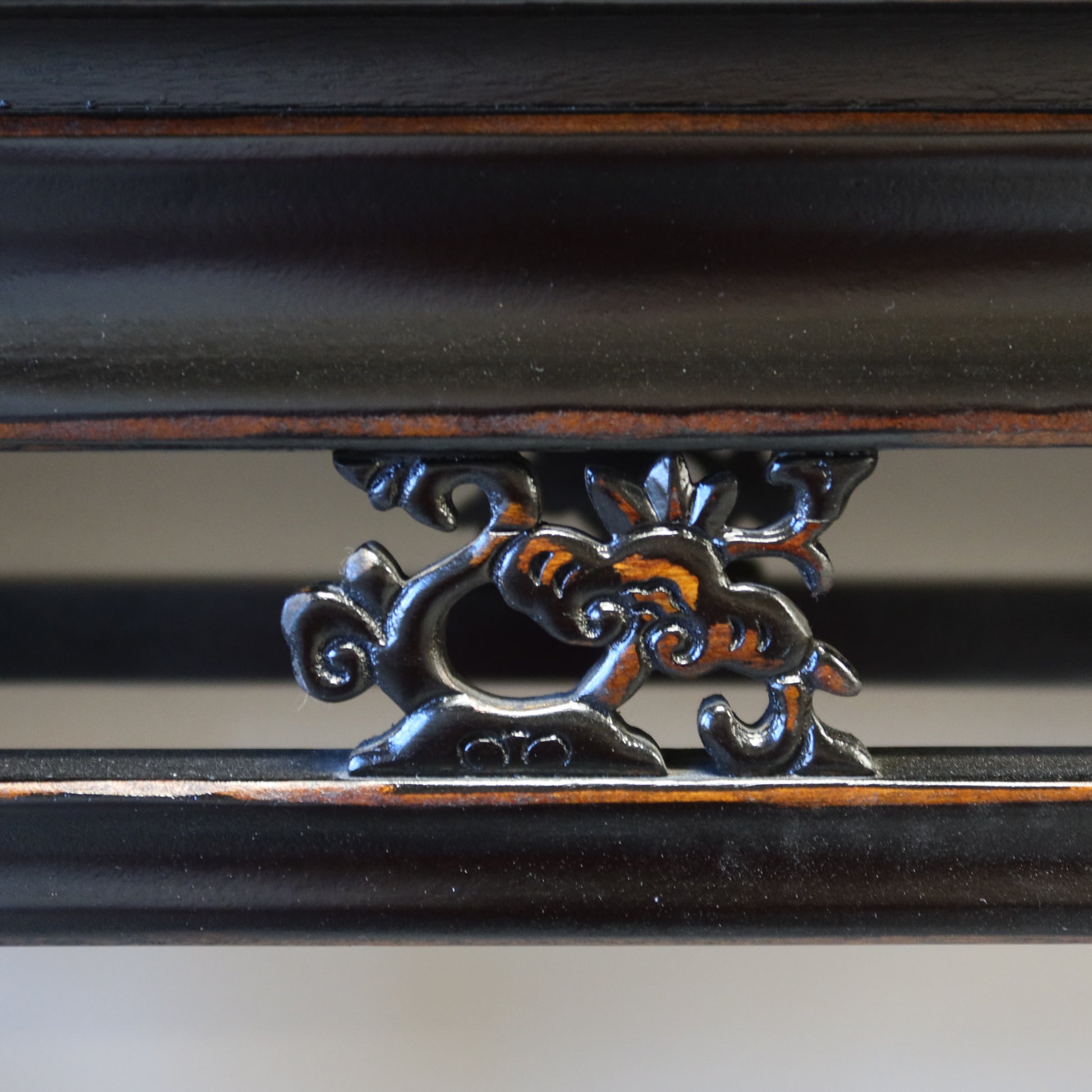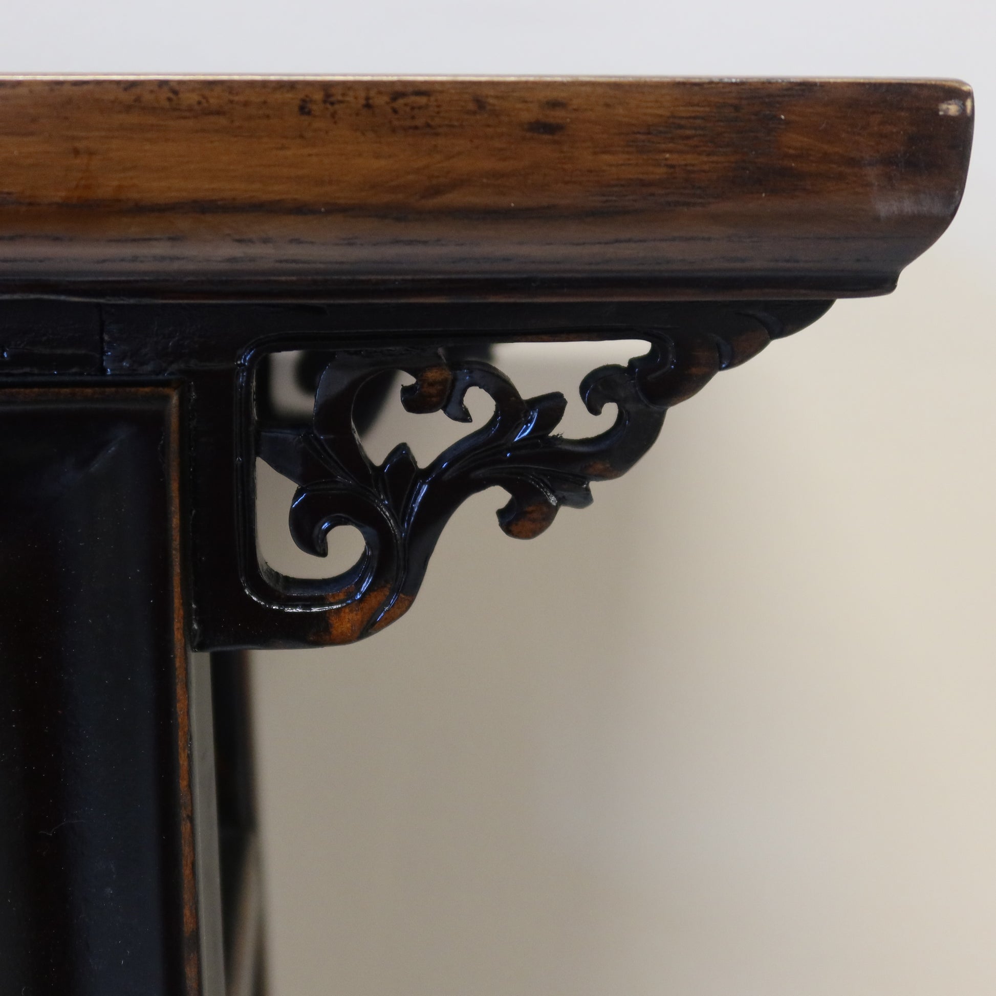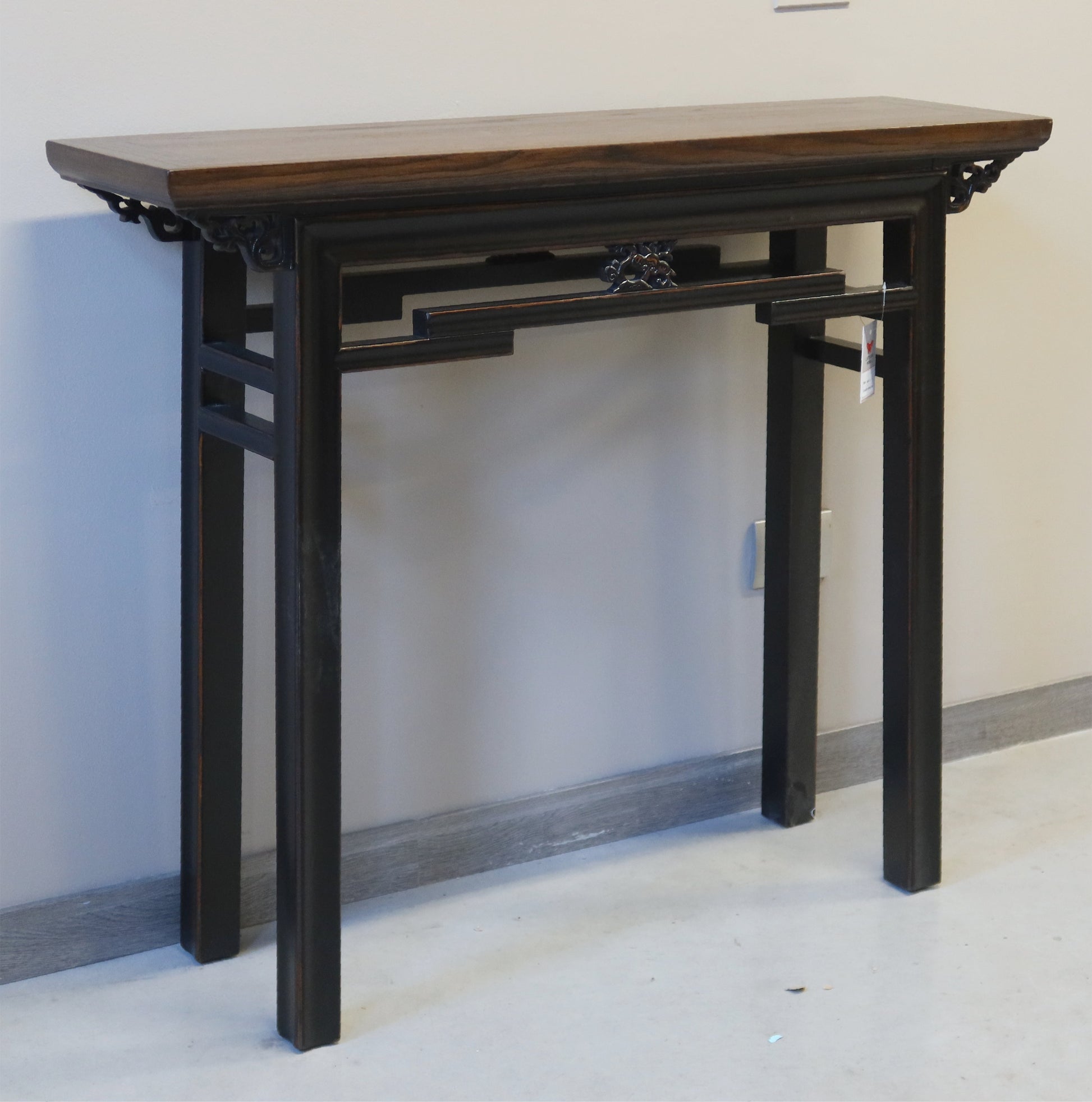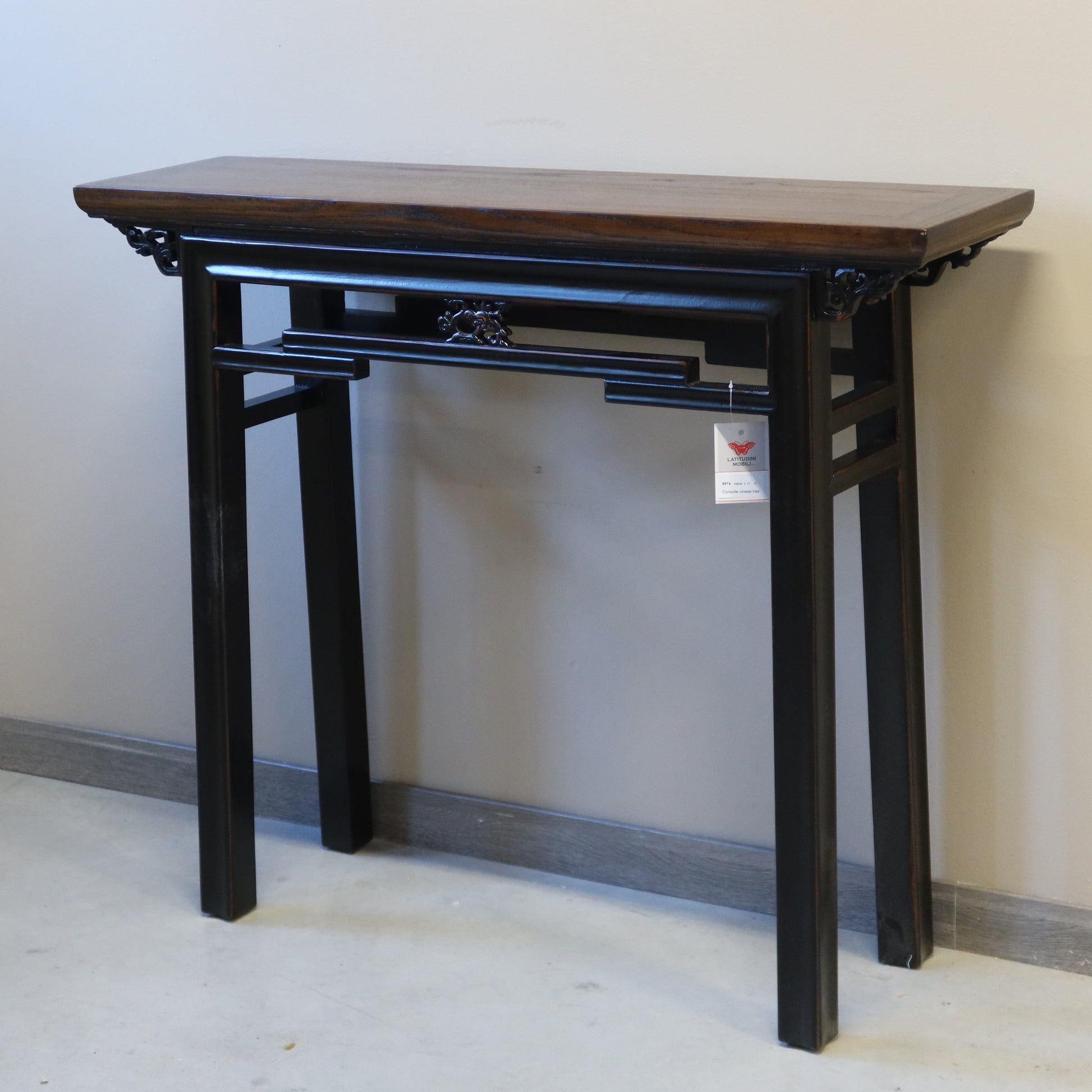 Console etnica in olmo naturale. Linee leggere con delicati raccordi intagliati. Ideale per un ingresso o un disimpegno, ma ottima in qualunque parte della casa in cui si ha bisogno di un piano d'appoggio elegante e non ingombrante.