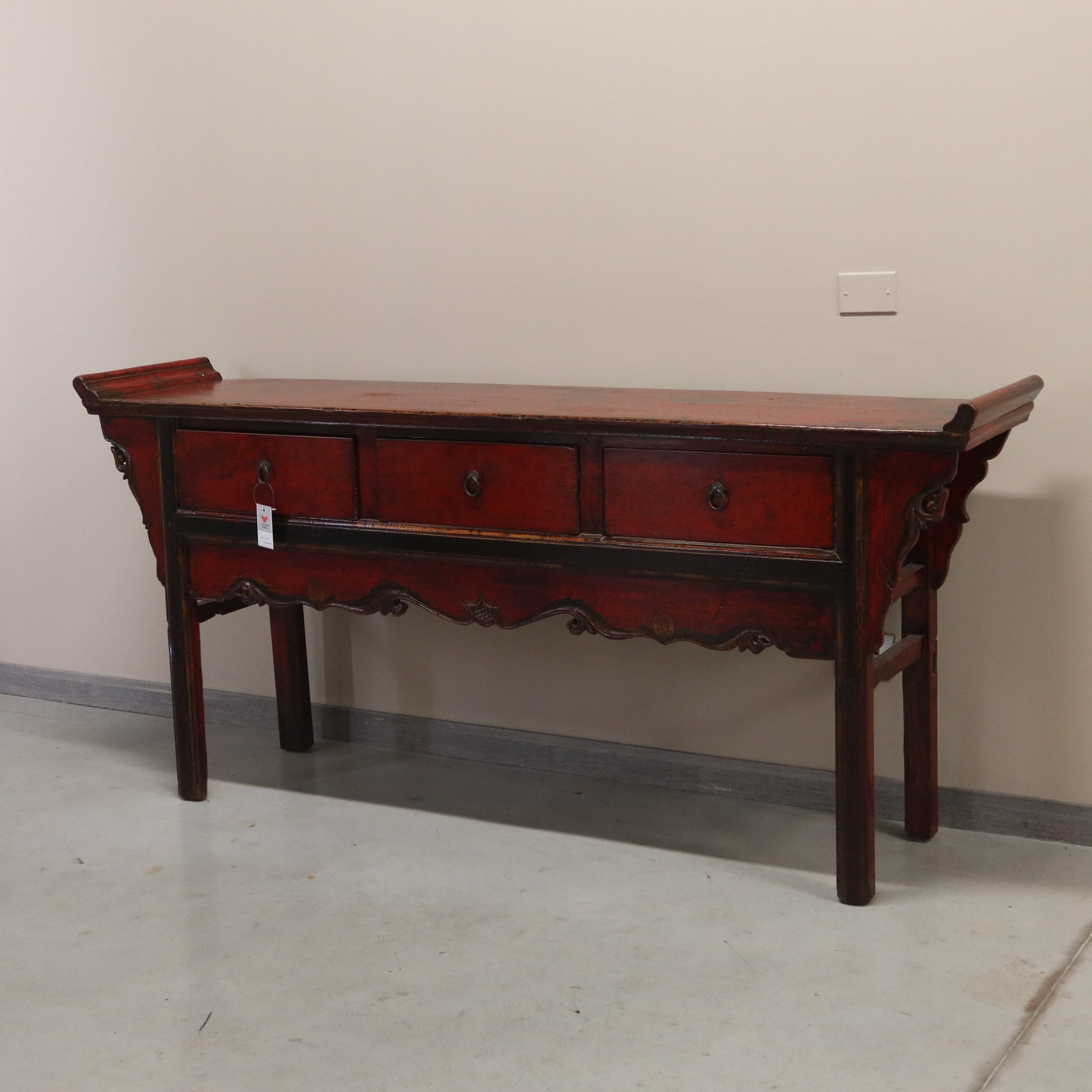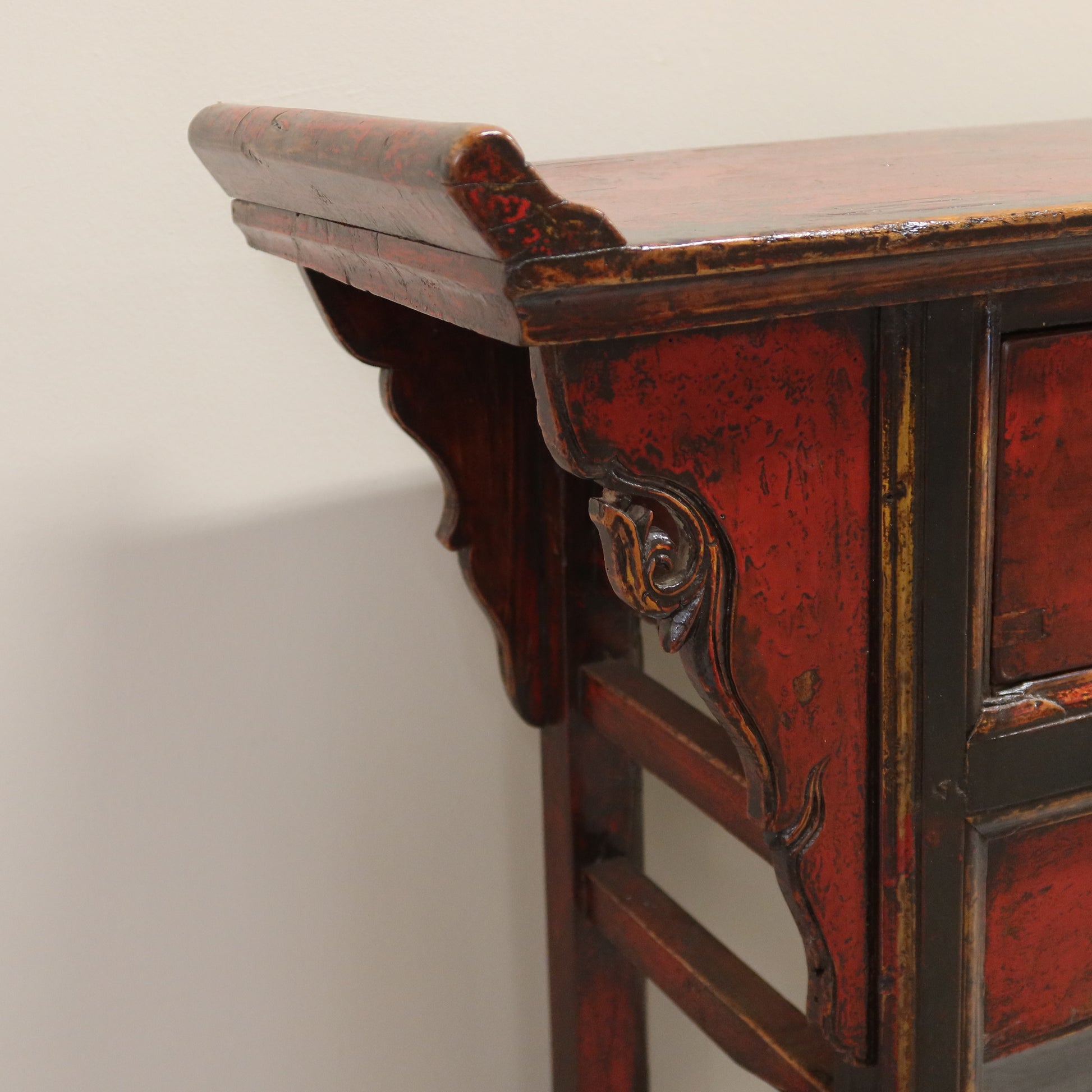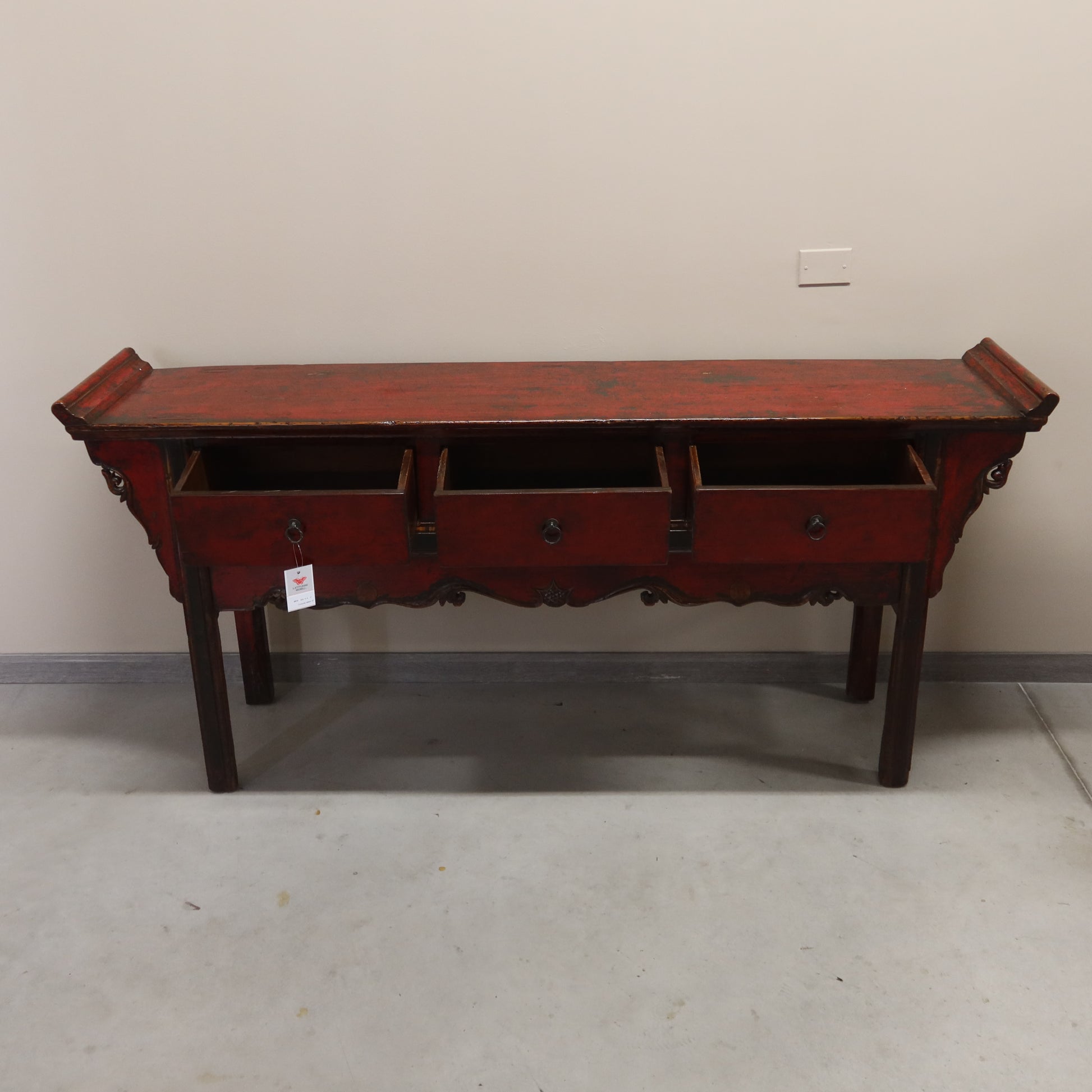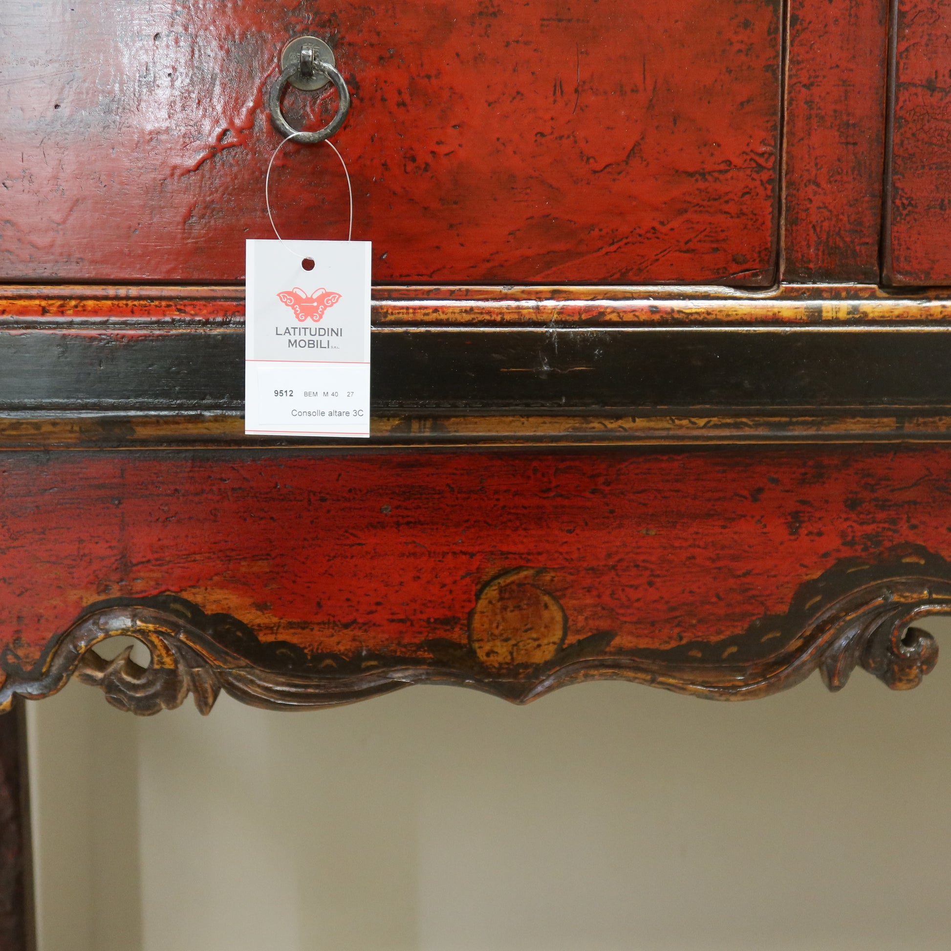 Bellissimo tavolo da appoggio o da centro in lacca rossa con fascia di cassetti e grembiule di raccordo tra le gambe intagliato.